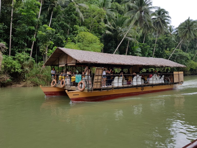 Restaurangen lägger ut på floden och det vackra, böljande landskapet med en nästan regnskogsartad växtlighet glider långsamt förbi. Att långsamt färdas på det gröna flodvattnet med den blå himlen och de upptornande bymolnen blir till en nästan meditativ upplevelse. På en av de högsta kullarna ser jag ett kors, Filippinerna är fortfarande ett djupt troende land. Det sker en långsam förändring bort från den oreflekterande, nästan medfödda tron på himmel och helvete, men ännu en tid kommer de bibliska korsen att blicka ned på de risodlande bönderna.