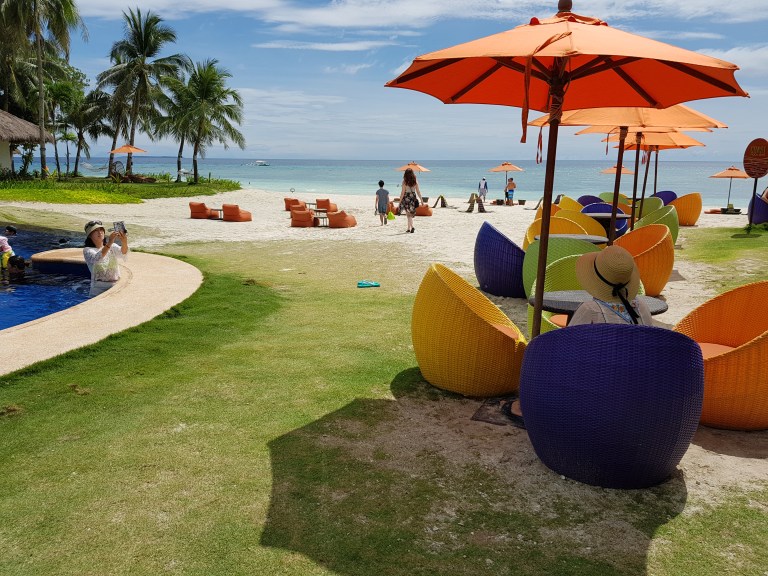Första stoppet blir South Palms Resort. Den ligger på östra sidan av Panglao. Här öppnar sig palmskogen mot ett ljusblått hav som längre ut övergår i en turkos nyans. Den vita sanden bränner under fötterna, solens strålar reflekteras och nästan dubblerar värmen och blir till en hetta som bränner mot huden. Det är verkligen vackert som i det tänkta paradiset, så varför välja ett annat ord? På en del av stranden växer cocospalmer helt strandnära och bakom dessa ligger hyddorna som man kan hyra.